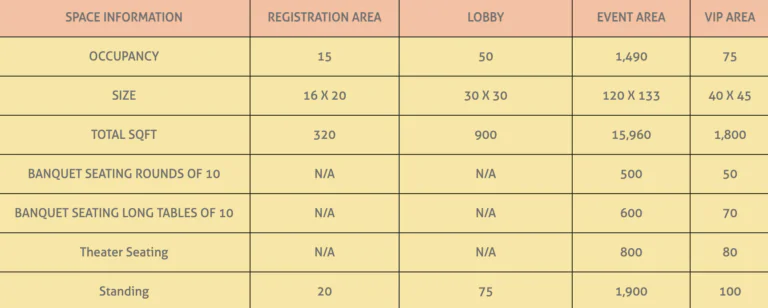 To help you plan, we’ve provided a detailed chart below, outlining each of our space measurements, square footage for different areas, and occupancy for various event setups. Whether you’re planning a banquet-style seating arrangement, a theater layout, or a cocktail reception, we can provide you with the space configuration that best suits your event’s needs. If you have any questions about our services, availability, or setup options, our team is only a phone call away. We’re here to make sure that from the initial consultation to the final clean-up, your event exceeds expectations.